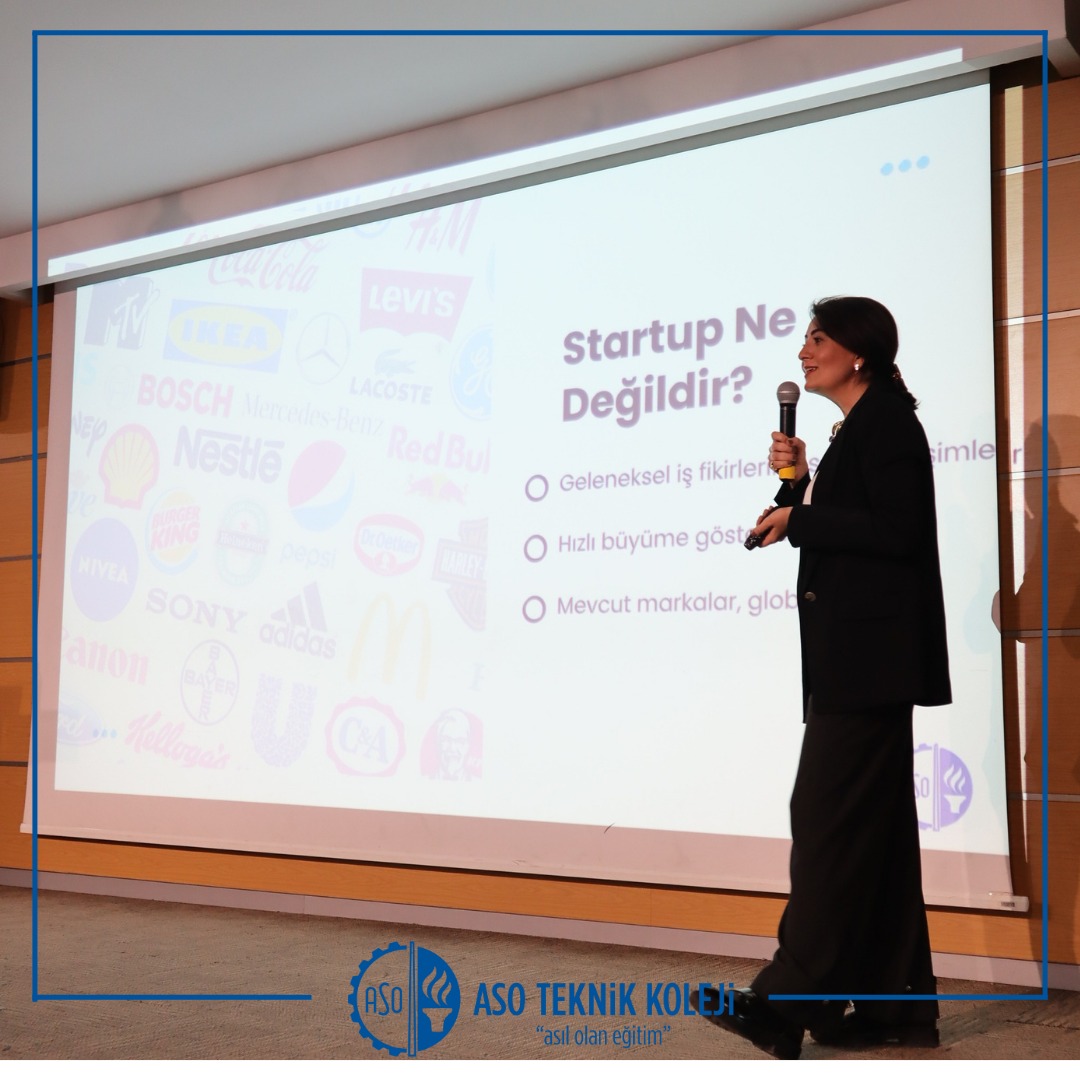 Akademisyen ve Girişimci Sayın Dr. Begüm Şahin, ASO Teknik Koleji 11. sınıf öğrencilerine yönelik gerçekleştirdiği “Startup Ekosistemi ve Gelecek Tasarımı” konulu seminerde gençlere ilham veren bir sunum yaptı. Öğrencilerin vizyonunu genişleten bu önemli etkinliğe, ASO Eğitim Vakfı Yönetim Kurulu Üyesi Sayın Serdar Tütek de katılarak öğrencilerle bir araya geldi. Etkinlik, gençlerin geleceğe dair farkındalıklarını ve girişimcilik motivasyonlarını güçlendirdi.
